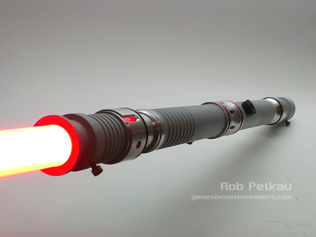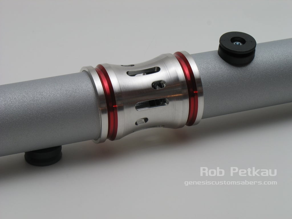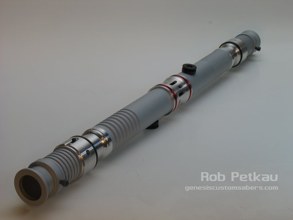 This set of two sabers is artfully textured with a durable media blast powdercoating. Both sabers have the Crystal Shard sound card installed, and can be used as two seperate sabers, or joined with the included coupler to make a formidable Dual Bladed lightsaber.
