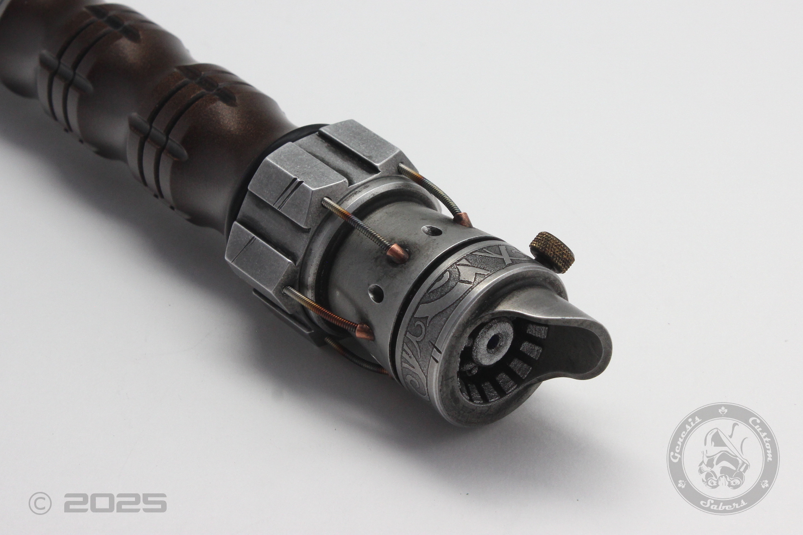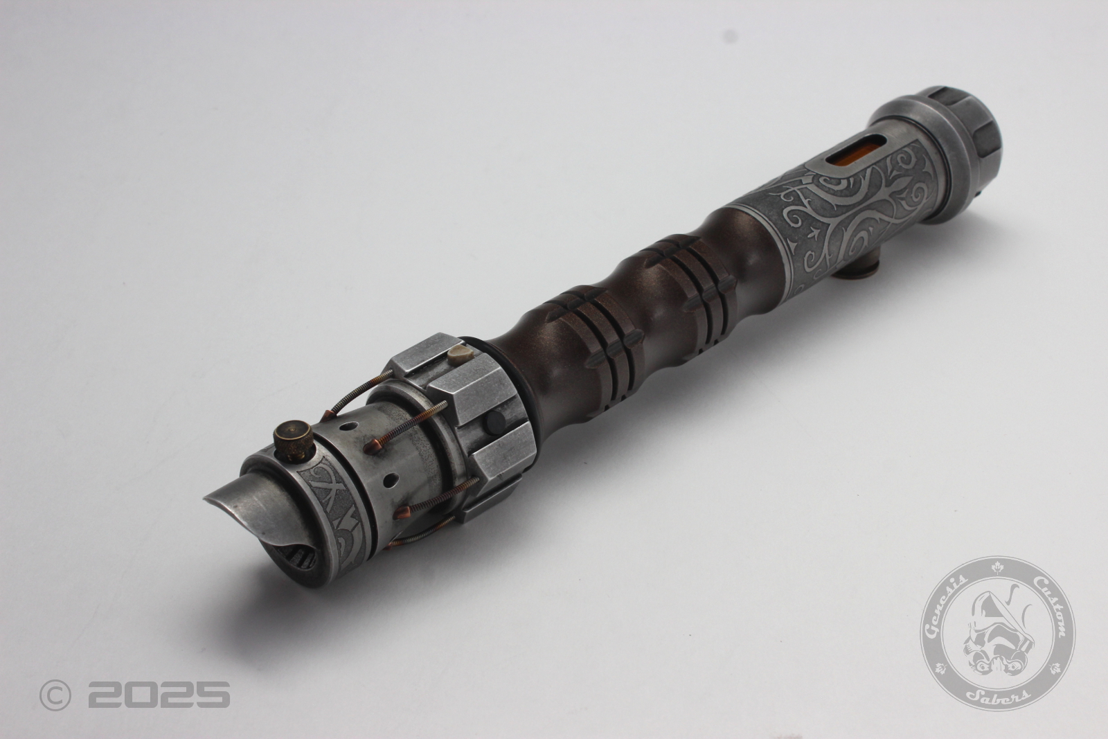 The protovolved style for the GCS Creed saber has become a popular customization. This is the first time I have paired that detail with my Firevine artwork. There’s something about the heat-tinted armoured cables that just fits with the Firevine pattern. Subtle battle damage and the authentic feel of aging and weathering techniques, makes this a special piece you will want to display. And… you can fight with it! As with most of my customized Production Series Sabers, they are certified for all but the hardest duelling.